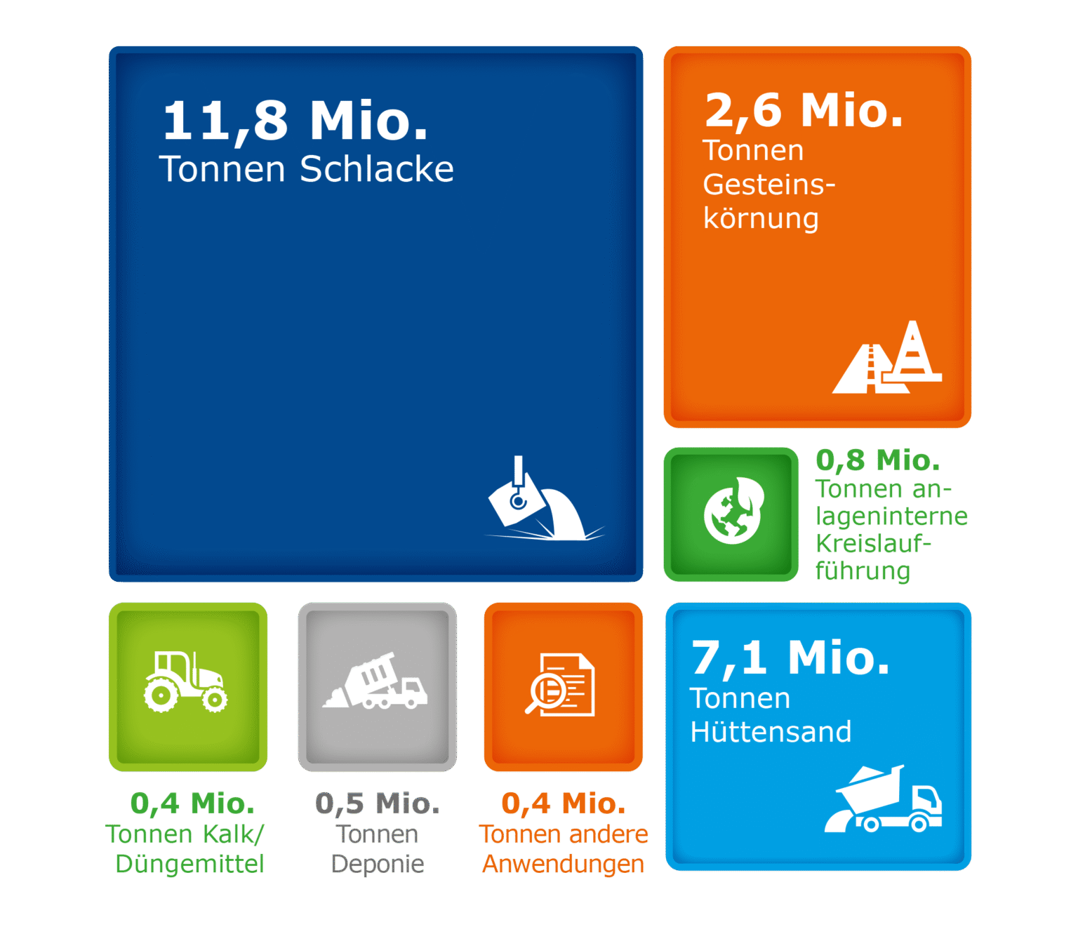 Bei der Produktion von Roheisen und Stahl entsteht ein wertvoller Rohstoff: Schlacken, sogenannte Eisenhüttenschlacken. Rund 11 Millionen Tonnen dieses künstlichen Gesteins, das dem vulkanischen sehr ähnlich ist, werden pro Jahr in Deutschland erzeugt. In Europa sind es etwa 35 Millionen Tonnen. Ein Großteil davon – rund 95 % – findet Verwendung in Zement, Beton, Düngemitteln oder anderen nützlichen Produkten.